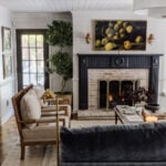 Para unir todo con el resto de nuestra casa, le dimos a la repisa de la chimenea un tono nuevo y temperamental: Benjamin Moore Temptation, un azul marino intenso que se siente rico y relajante. Volvimos a pintar las paredes en Sherwin Williams Shiplap, un blanco cremoso que agrega calidez sin sentirse amarillo, y actualizamos las molduras y las puertas en Sherwin Williams Urbane Bronze.